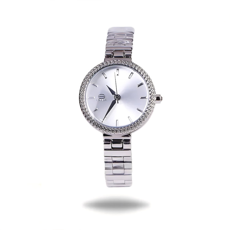 قاب فلزی با رنگ نقره ای، زیبایی و لمس زنانگی را به هر استایلی القا میکند. با صفحهی گرد و نمایشگر ایندکس خط دار و قاب کنگره ای ، این ساعت انعطافپذیری و زیبایی را به ترکیبی ایدهآل تبدیل میکند.