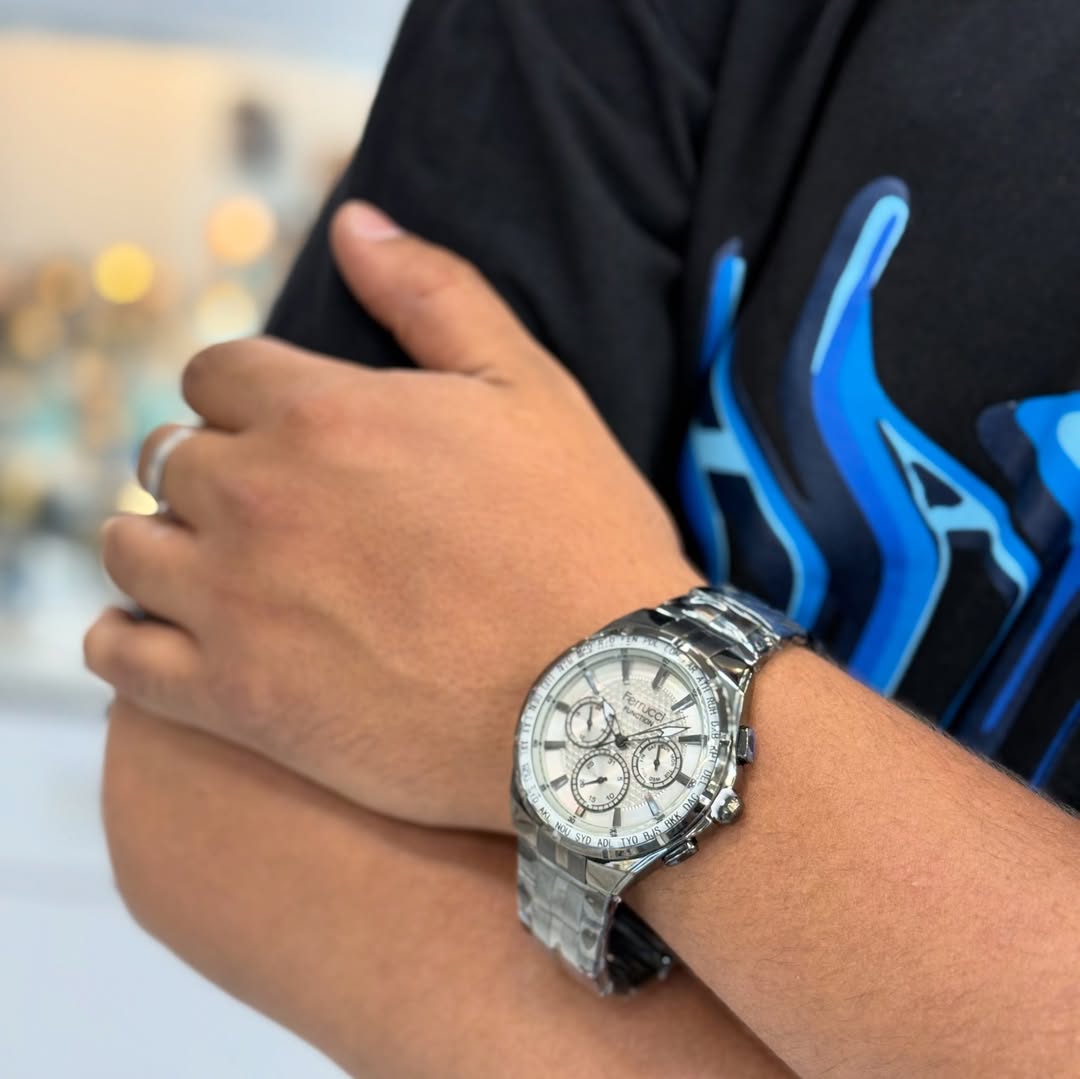 ساعت مچی مردانه با سه موتور فعال، رنگ ثابت، موتور اصل ژاپن و ضد آب، همچنین دارای یکسال ضمانت کارکرد موتور.