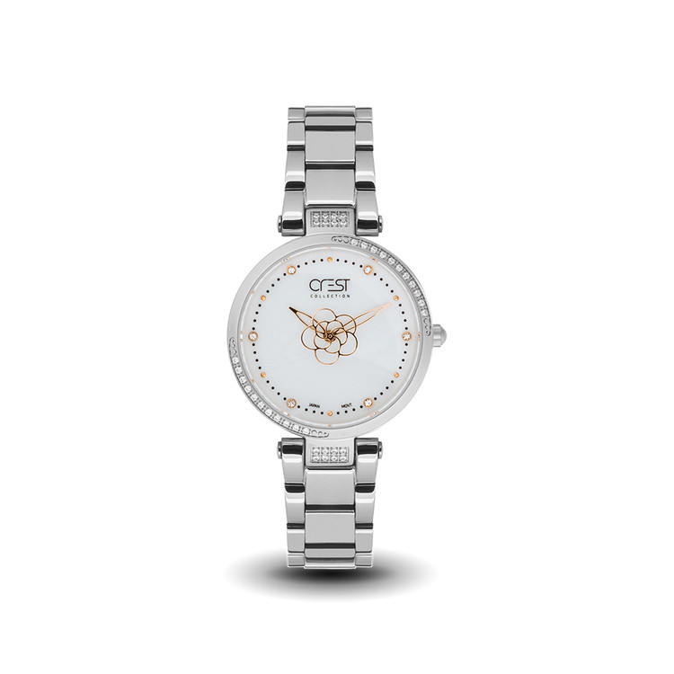 قاب فلزی با رنگ نقره ای، زیبایی و لمس زنانگی را به هر استایلی القا میکند. با صفحهی گرد و نمایشگر ایندکس نگین دار و طرح گلی که در وسط صفحه کار شده ، این ساعت انعطافپذیری و زیبایی را به ترکیبی ایدهآل تبدیل میکند.