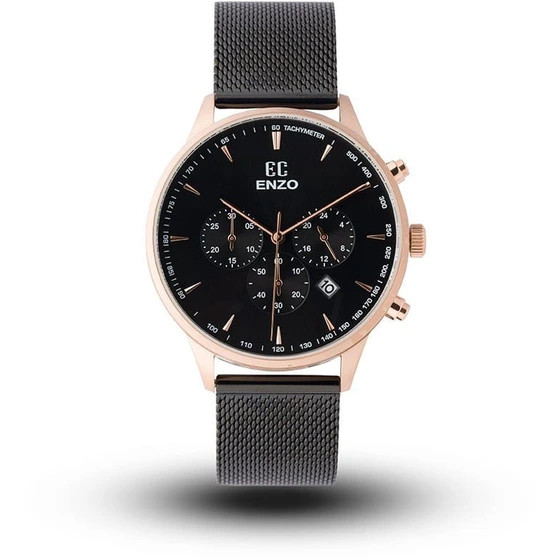 ساعت مچی مردانه انزو مدل EC1858 با طراحی گرد و بند حصیری مشکی و صفحه مشکی از جذابیت و شیکی بینظیری برخوردار است. جنس بدنه از استیل رزگلد با کیفیت بالا، به آن ظاهری خوشپوشانه و با دوام میبخشد. این ساعت با استایل اسپرت مناسب برای مردان شیک پوش است.