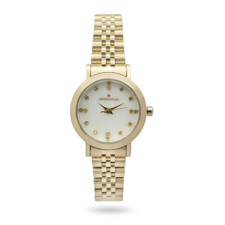 قاب فلزی با رنگ طلایی، زیبایی و لمس زنانگی را به هر استایلی القا میکند. با صفحهی گرد و نمایشگر ایندکس نگینی و قاب گرد ، این ساعت انعطافپذیری و زیبایی را به ترکیبی ایدهآل تبدیل میکند.