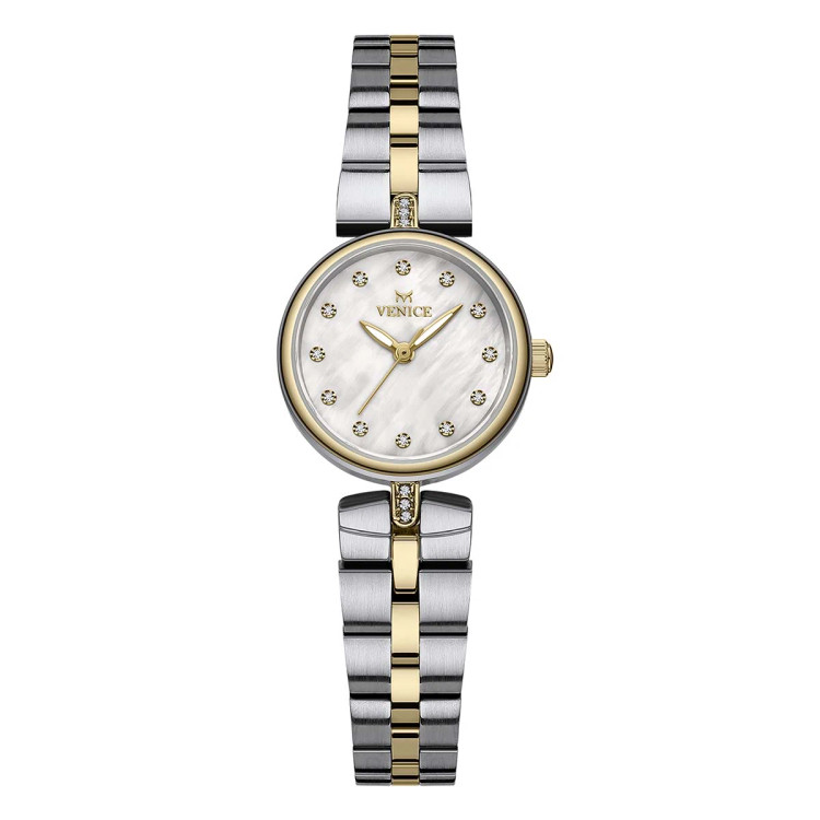 ساعت مچی زنانه ونیز ، نمایانگر زیبایی و عملکرد در یک طراحی زنانه زیبا است. این ساعت آنالوگ، با ۳ atm مقاومت در برابر آب، صفحهای گرد با رنگ سفید صدفی و نمایشگر ایندکس نگین دار دارد. با بستهبندی اورجینال و جعبهای شیک، این ساعت با بند استیل دورنگ طلایی سیلور و قفل دستبندی، انرژی خود را از باتری میگیرد. موتور کوارتز ژاپنی ساده، دقت بالایی ارائه میدهد و با طراحی زیبا و جنس فلزی، استایلهای کژوال، رسمی و کلاسیک را پوشش میدهد. با یک سال گارانتی ، این ساعت از برند اورجینال ونیز است. از ساعت زیبایی این شاهکار را به مچ خود ببندید و از زیبایی و دقت آن لذت ببرید.