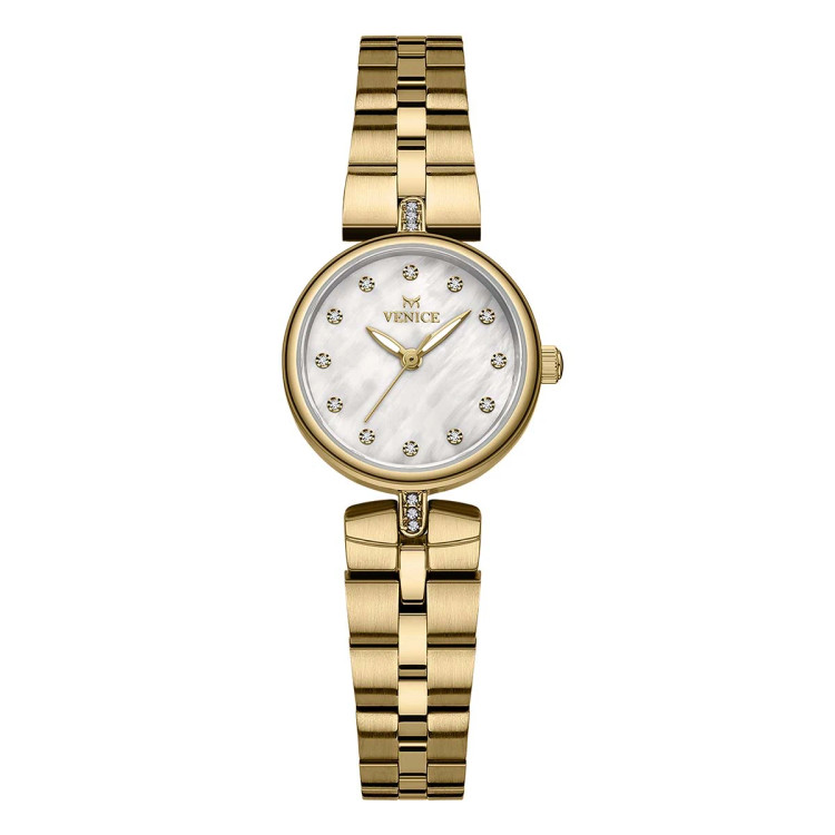 ساعت مچی زنانه ونیز ، نمایانگر زیبایی و عملکرد در یک طراحی زنانه زیبا است. این ساعت آنالوگ، با ۳ atm مقاومت در برابر آب، صفحهای گرد با رنگ سفید صدفی و نمایشگر ایندکس نگین دار دارد. با بستهبندی اورجینال و جعبهای شیک، این ساعت با بند استیل طلایی و قفل دستبندی، انرژی خود را از باتری میگیرد. موتور کوارتز ژاپنی ساده، دقت بالایی ارائه میدهد و با طراحی زیبا و جنس فلزی، استایلهای کژوال، رسمی و کلاسیک را پوشش میدهد. با یک سال گارانتی ، این ساعت از برند اورجینال ونیز است. از ساعت زیبایی این شاهکار را به مچ خود ببندید و از زیبایی و دقت آن لذت ببرید.
