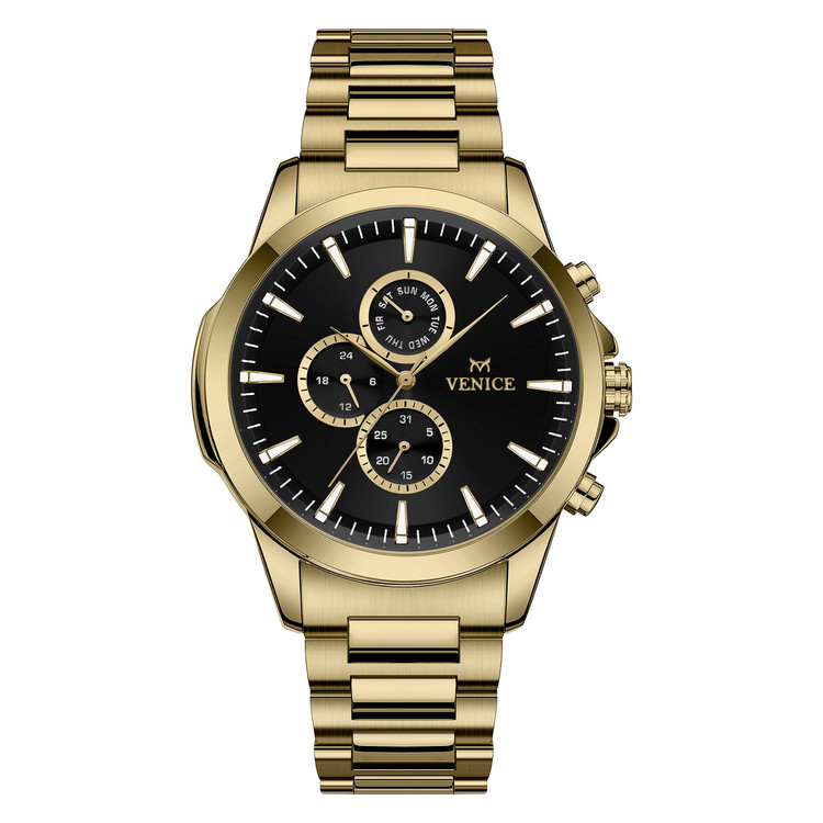 ساعت مچی مردانه ونیزمدلVN80162تمام طلایی سه موتور فعال، مناسب برای مردانی است که به دنبال جزئیات فنی و طراحی شیک هستند. بسته بندی شیک اورجینال و امکانات گارانتی و خدمات پس از فروش برای خریداران اهمیت زیادی دارد.