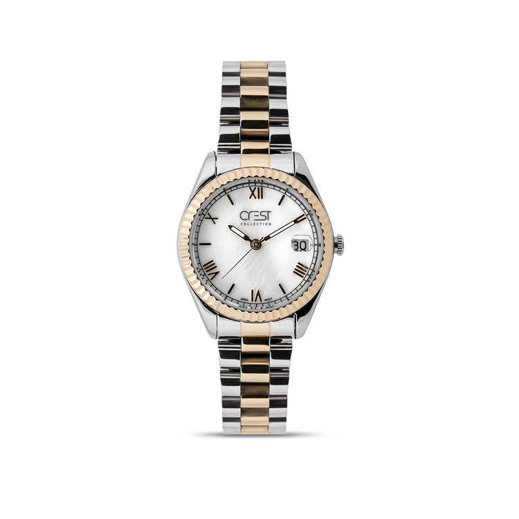 ساعت مچی زنانه CREST نمادی از زیبایی و سلیقه در جهان اکسسوریهای زنانه، با میزان مقاومت در برابر آب ۳ atm و طراحی آنالوگ، در رنگ نقرهای طلایی ، یک جواهر نفیس در دست زنان است. این مدل، با قابلیتهایی چون موتور ساده ژاپنی اعتبار برند را با گارانتی یک سال و خدمات پس از فروش دو سال، تضمین مینماید.