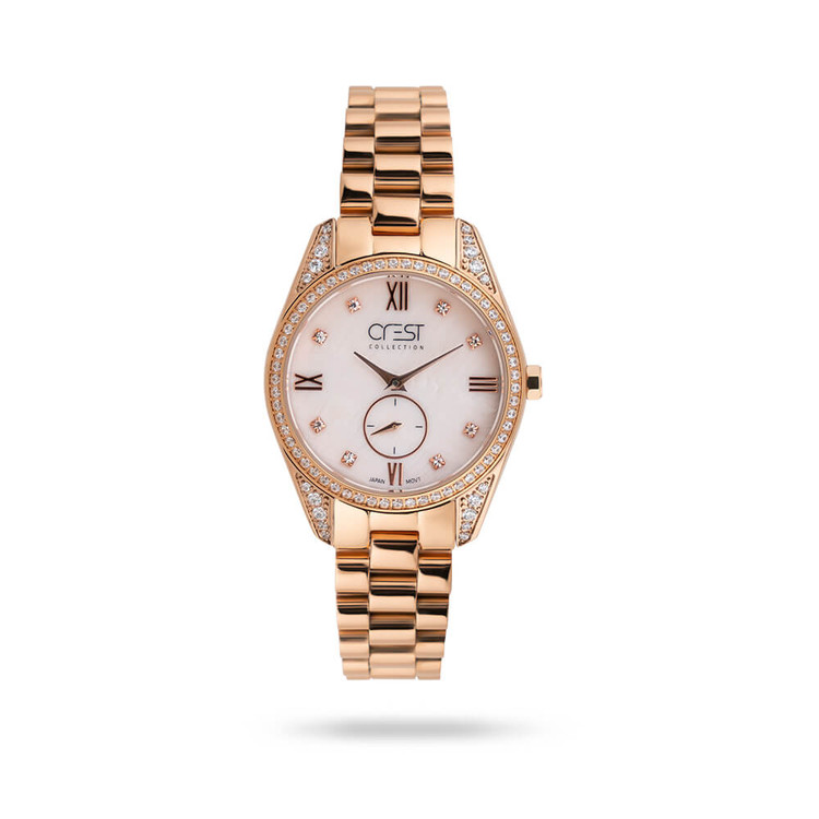 ساعت مچی زنانه CREST نمادی از زیبایی و سلیقه در جهان اکسسوریهای زنانه، با میزان مقاومت در برابر آب ۳ atm و طراحی آنالوگ، در رنگ رزگلد ، یک جواهر نفیس در دست زنان است. این مدل، با قابلیتهایی چون موتور ساده ژاپنی اعتبار برند را با گارانتی یک سال و خدمات پس از فروش دو سال، تضمین مینماید.