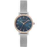 قاب فلزی ساعت، زیبایی و لمس زنانگی را به هر استایلی القا میکند. با صفحهی گرد سرمه ای رنگ و نمایشگر ایندکس خط دار، این ساعت انعطافپذیری و زیبایی را به ترکیبی ایدهآل تبدیل میکند.